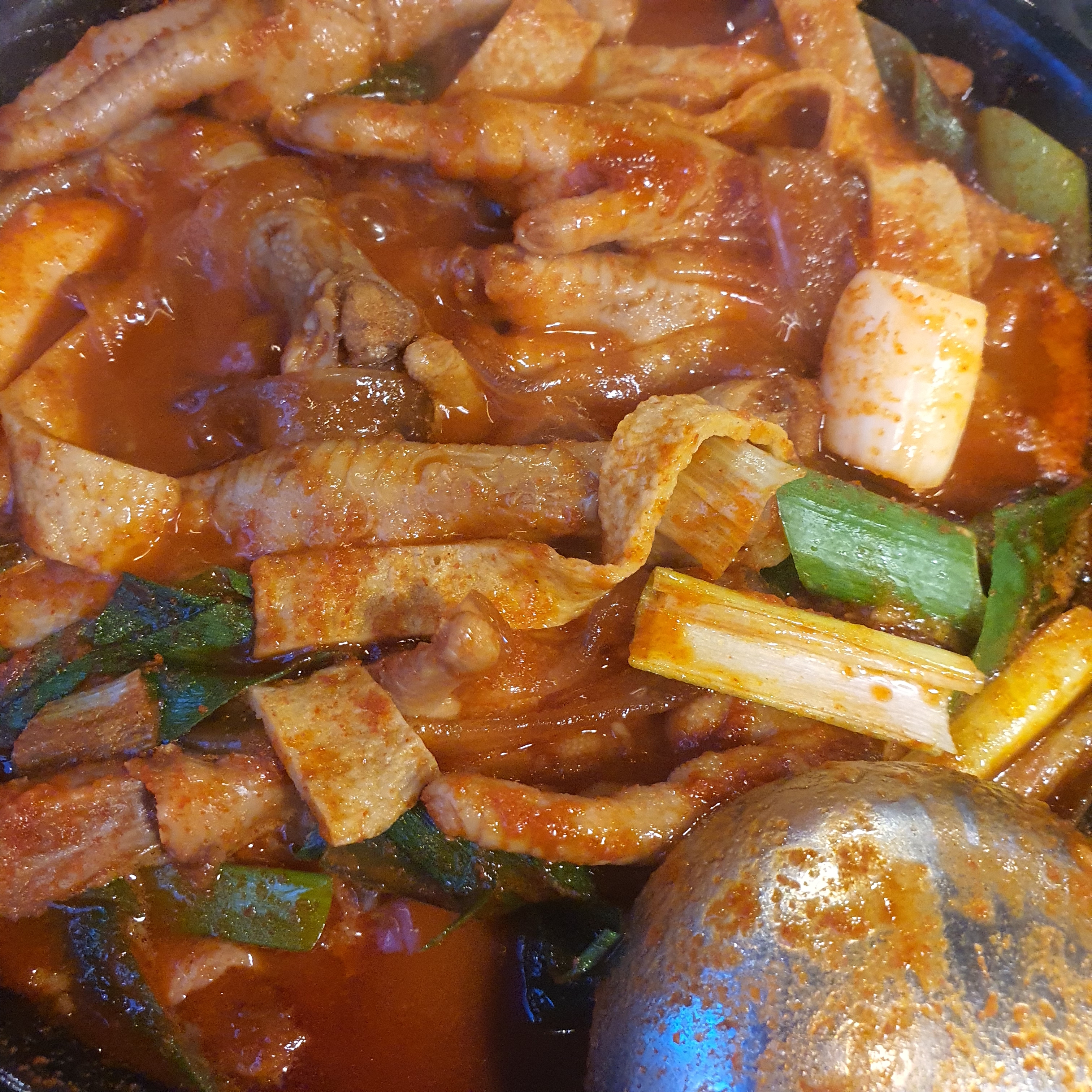 드디어 기다리고 기다렸던 닭발 맛집 추억닭발에 가게 되었다 😍 생전처음 가보게 된 닭발맛집 부평에 위치하는 추억닭발 본점이다 👏 기대되는 가운데, 8시쯤 갔었나? 평일이었는데도 자리가 한자리만 딱 있었다 👌 우리는 추억세트로 메뉴를 정했고, 뼈 있는 닭발로 매운맛과 덜 매운맛을 고를 수 있었는데, 매운맛으로 선택! 사리는 김가루밥과 우동사리, 볶음밥 중 선택할 수 있었는데, 김가루밥으로 결정! 주문 후 바로 나온 단무지와 약간 싱거운 미역국! 매운맛을 중화시켜 주기 위해 미역국의 간을 심심하게 해 놓은 것 같았다 👌 그리고 나온 닭발! 파가 엄청 올라가 있고, 닭발은 이미 익혀져 있는 것 같았다 어묵하고 납작 당면이 들어가 있는 즉석 떡볶이 스타일의 닭발이었는데, 생전 처음 보는데도 맛이 있을 거라는 확..